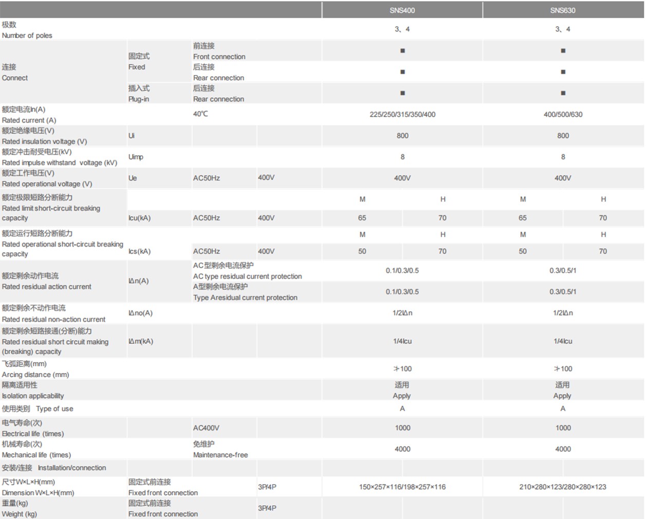 SNS125, SNS250 L/M/H type, SNS400,SNS630 L/M/H type thermal magnetic type and the above specifications four pole neutral pole type A, B circuit breakers can be with "thermal overload alarm without tripping" function to ensure power supplycontinuity and meet the requirements of Article 6.3.6 of GB50054.