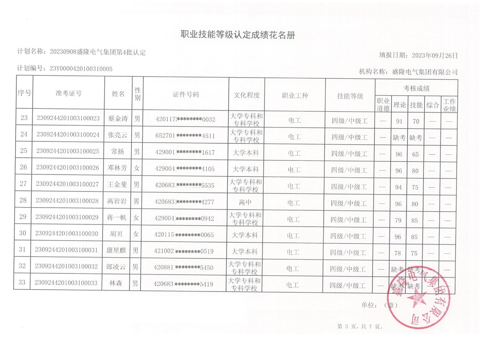 盛隆電氣集團2023年第六批職業技能等級認定成績公示