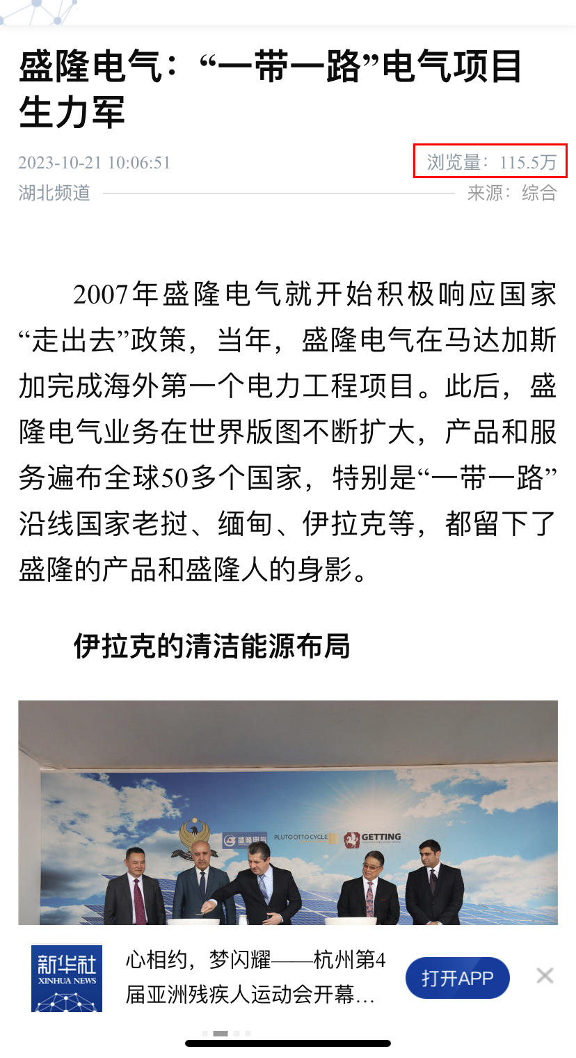 10月17日-18日,第三屆“一帶一路”高峰論壇在北京舉行。10月21日,新華社報道:《盛隆電氣:“一帶一路”電氣項目生力軍》,該稿件僅發(fā)布一天,瀏覽量就已經超過100萬,引發(fā)廣泛關注。盛隆電氣:“一帶一路”電氣項目生力軍記者:劉佳婧 2007年盛隆電氣就開始積極響應國家“走出去”政策,當年,盛隆電氣在馬達加斯加...2023-10-23 -