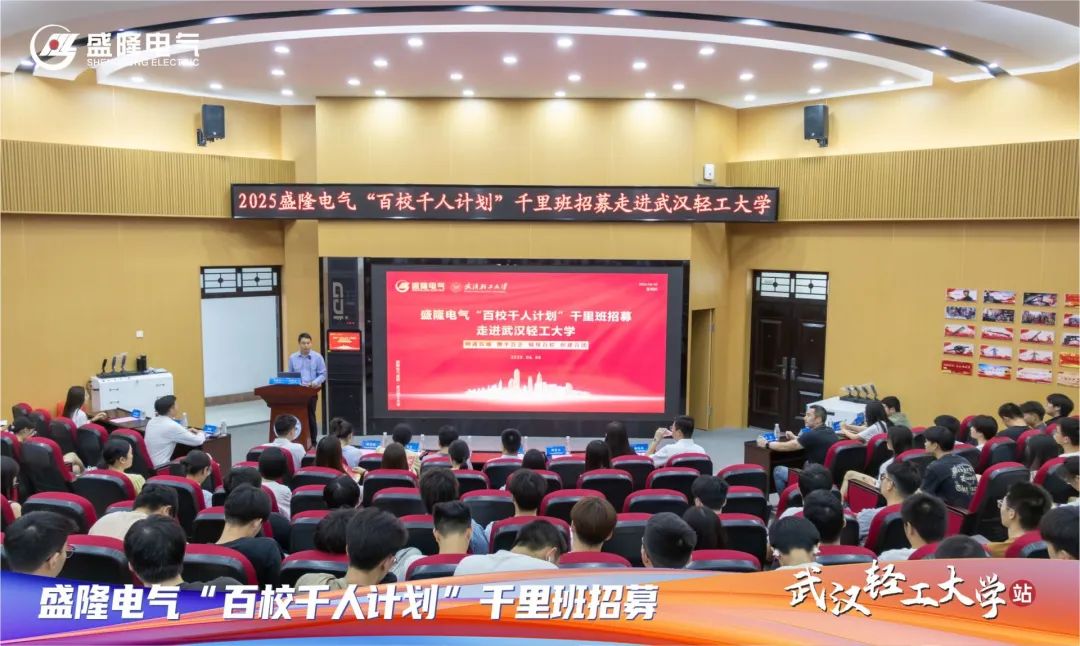 6月5日,“尋找未來之星 共同點燃夢想”——盛隆電氣“百校千人計劃”千里班招募活動,第六站走進雙湖之畔的武漢輕工大學。武漢輕工大學黨委常委、副校長王宏勛出席活動。盛隆電氣集團設計中心總經理董玲,武漢輕工大學校友、盛隆電氣集團財務中心大區經理陳慧媛登臺宣介。武漢輕工大學約300名學生參加。2025-06-06 -