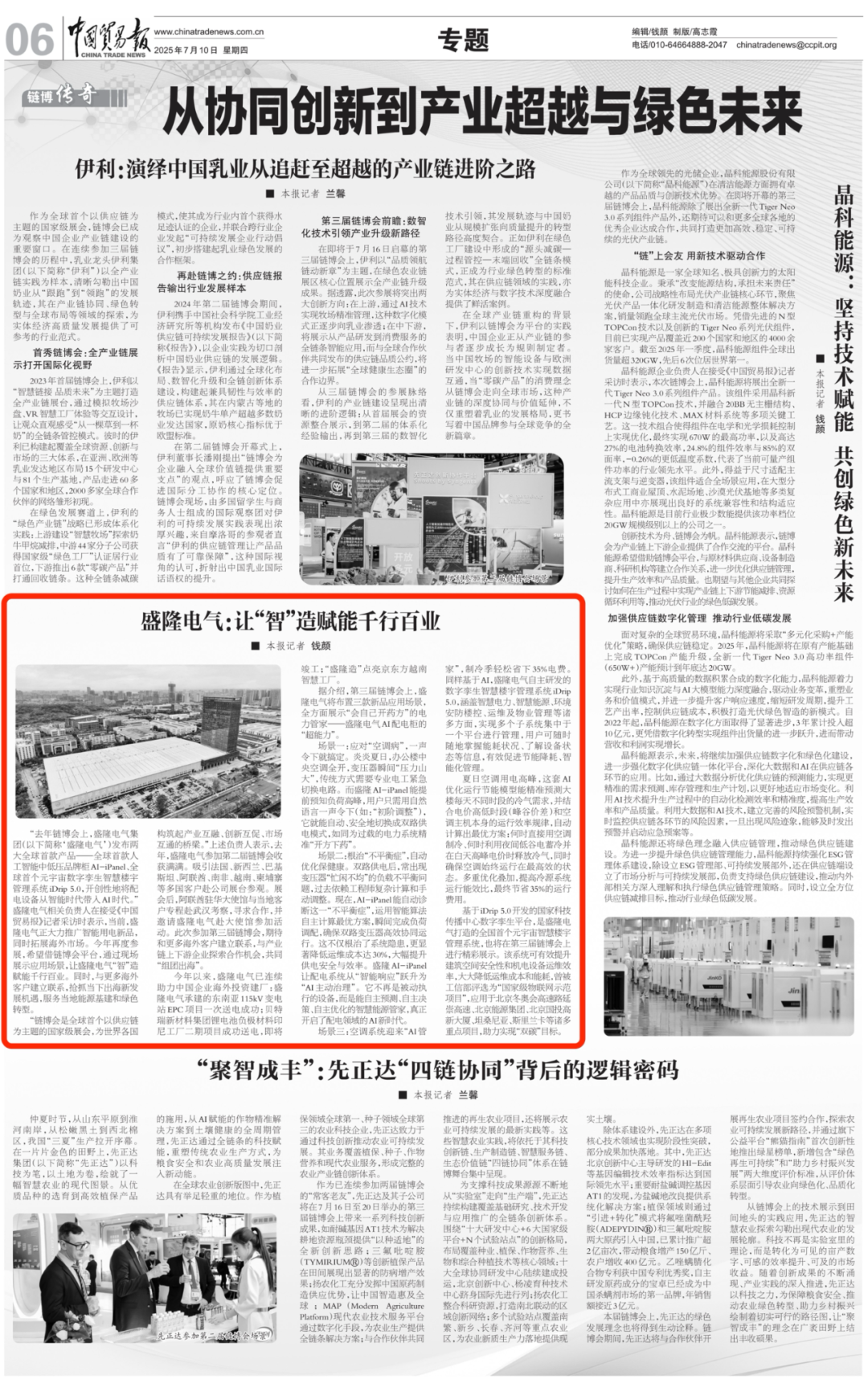 第三屆鏈博會即將開幕,中國貿易報回顧往屆參展企業,以“盛隆電氣:讓‘智’造賦能千行百業”為題,報道盛隆電氣大力推廣智能用電新品,拓展海外市場,借助鏈博會平臺,讓盛隆“智”造賦能千行百業。2025-07-12 -