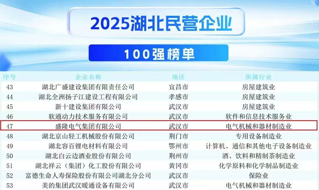 盛隆電氣榮獲2025湖北民營企業“雙百強”