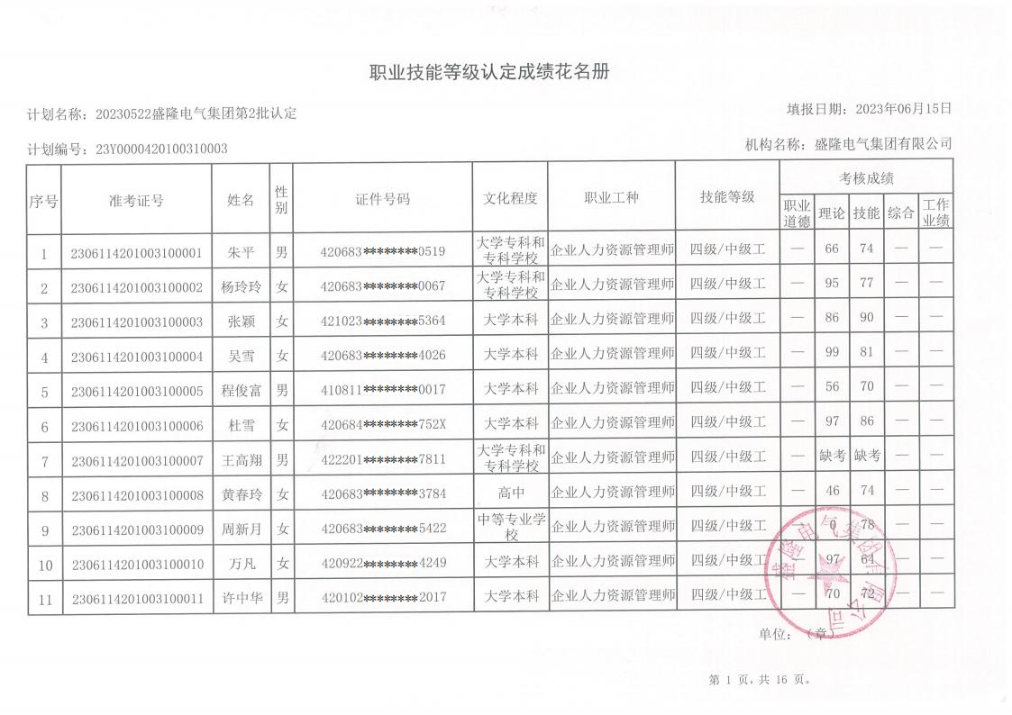 關于盛隆電氣第四批職業技能等級認定成績的公示